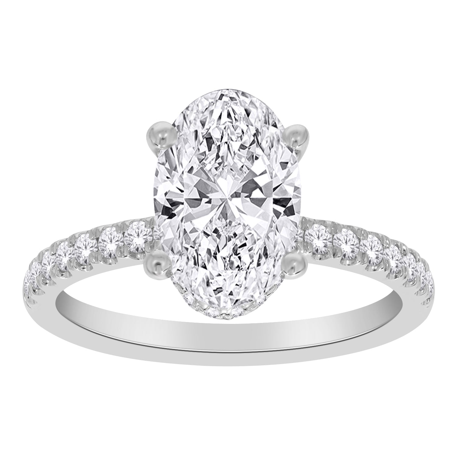 Lustrous White & Brilliant Sparkle. Stunning Oval Cut Lab Grown Diamond claw set with hidden halo and shoulder diamond accents.