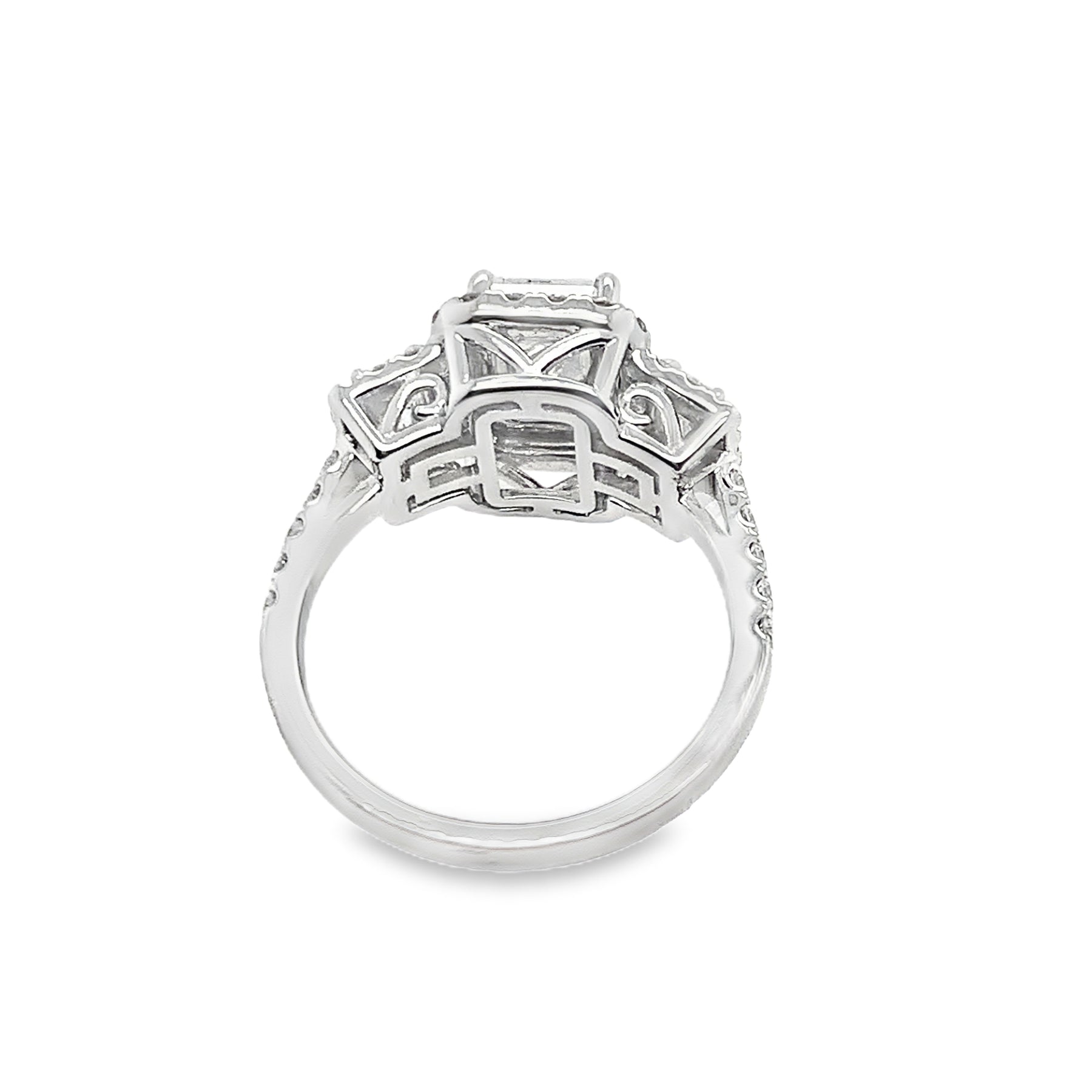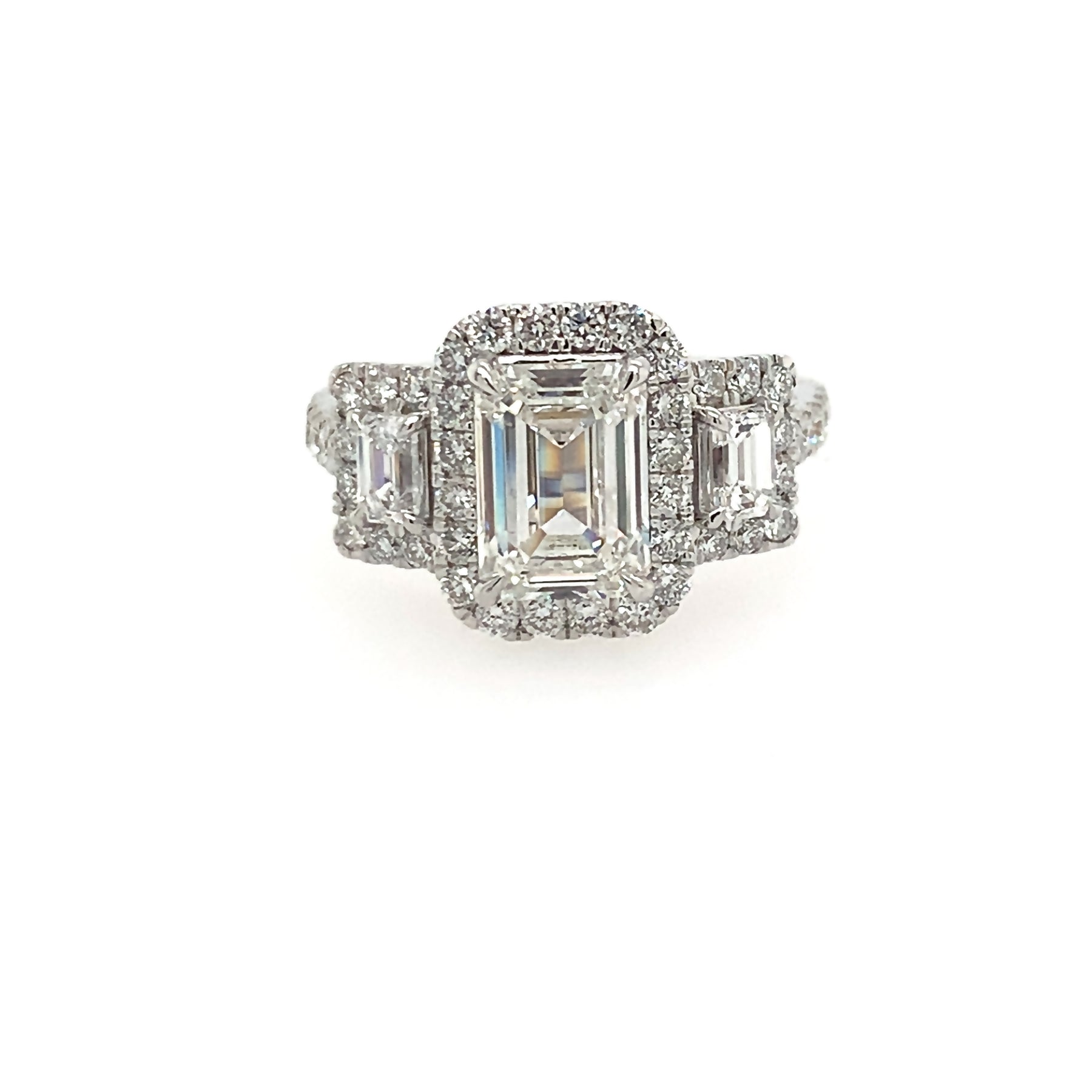 Create your statement with this all-diamond , emerald cut trilogy ring. Three emerald cut LabGrown Diamonds surrounded by round brilliant cut halos and shoulder accent diamonds. The ring exudes excessive glamour with immaculate sparkle.