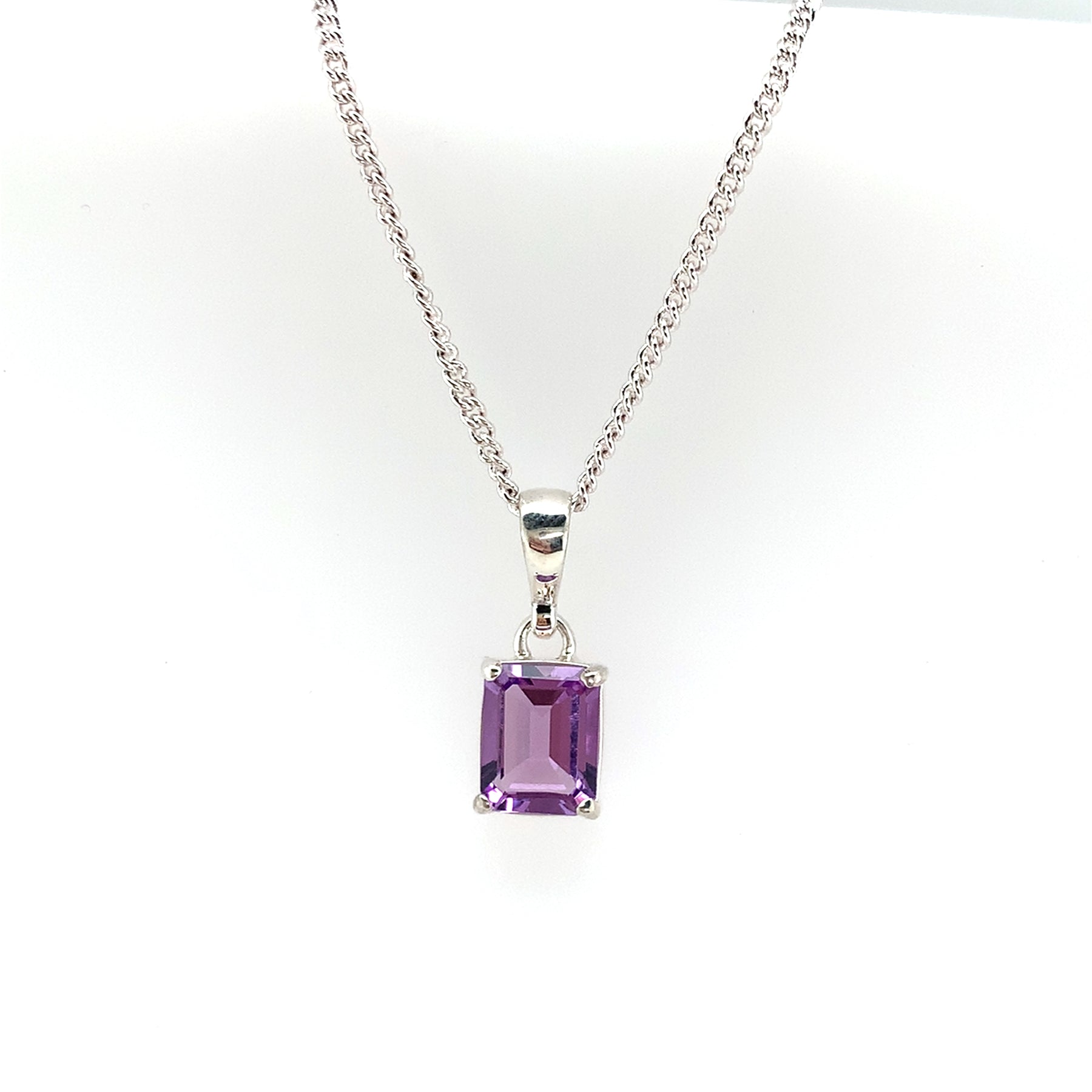Handmade Sterling Silver emerald-cut Amethyst, claw set solitaire pendant. High quality natural amethyst relatively transparent.